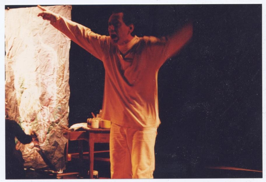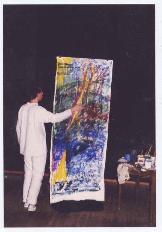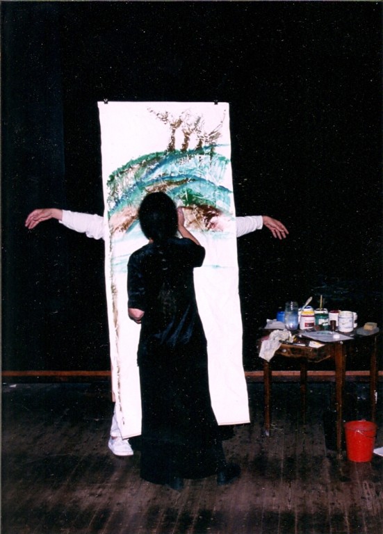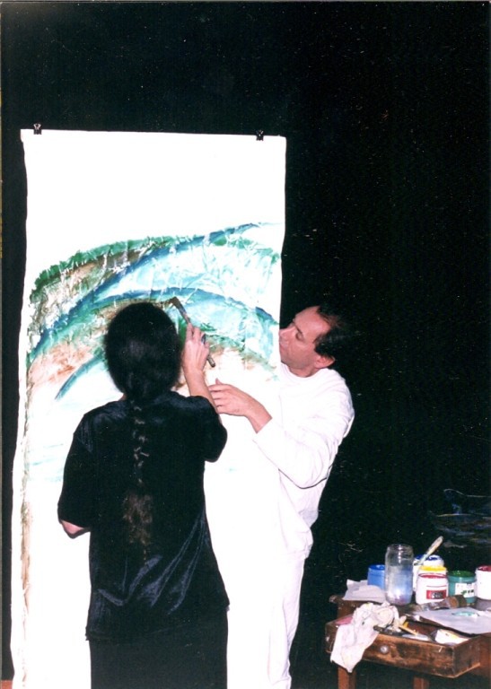 Il parle, elle peint : confusion. Le geste du pinceau vient se glisser dans les silences de la parole, lui répond, se superpose à elle. L'acteur jubile dans tous ses "comme si"... et sur les blancs de la toile, lorsque le geste se suspend, les mots poursuivent leur propre dessein.