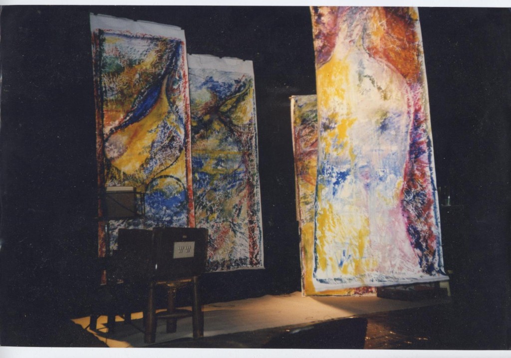 Devant le public, un acteur parle, une peintre peint. Il peint les mots, elle dit les couleurs. Silencieusement, elle déroule le texte d'une scène imaginaire, matière et couleurs, qu'elle invente devant nous sur la toile. Lui raconte, se laisse traverser par le texte ; il explore, répète, épuise toutes ces histoires d'enfance. Sa voix se prolonge dans d'autres voix que l'on entend, par intervalles, superposées, lointaines ou proches, chuchotées ou fortes : chœur des voix intérieures du texte.